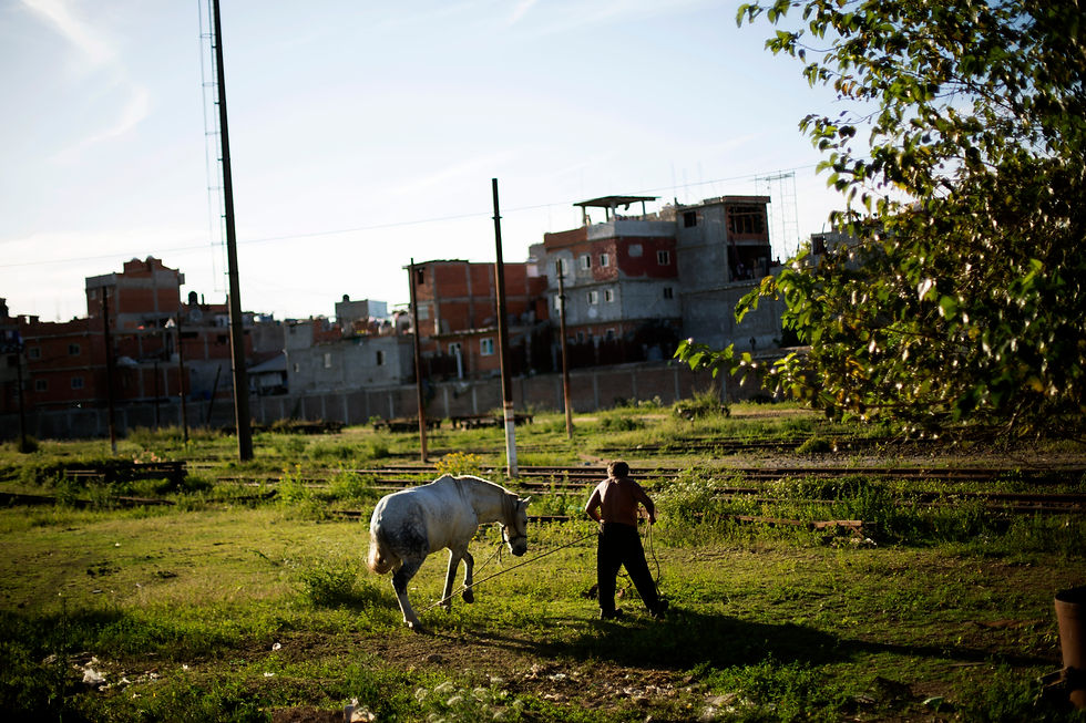 Man and his horse, in front of the shanty town in the neighborhood Chacarita, Buenos Aires, April 2017.